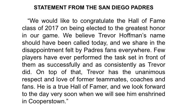 Statement from the #Padres regarding 2017 #HOF results: pic.twitter.com/jhNi5LTaRk