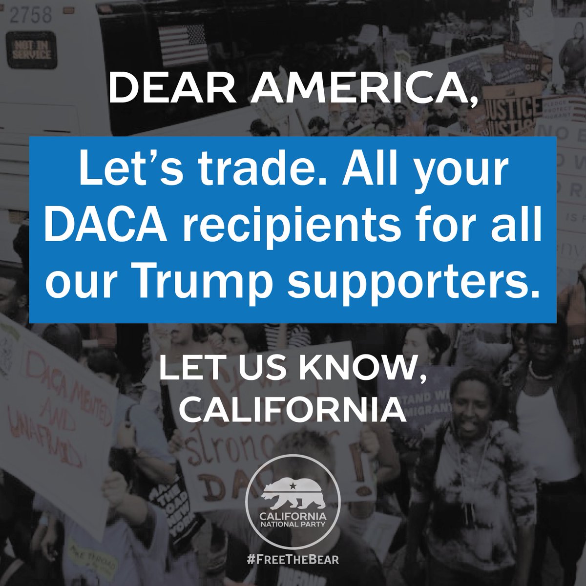 Hey U.S., we'll trade you your #DACA recipients for our Trump supporters. Deal? #KeepDACA #DefendDACA #FreeTheBearpic.twitter.com/F8R7HViCl8