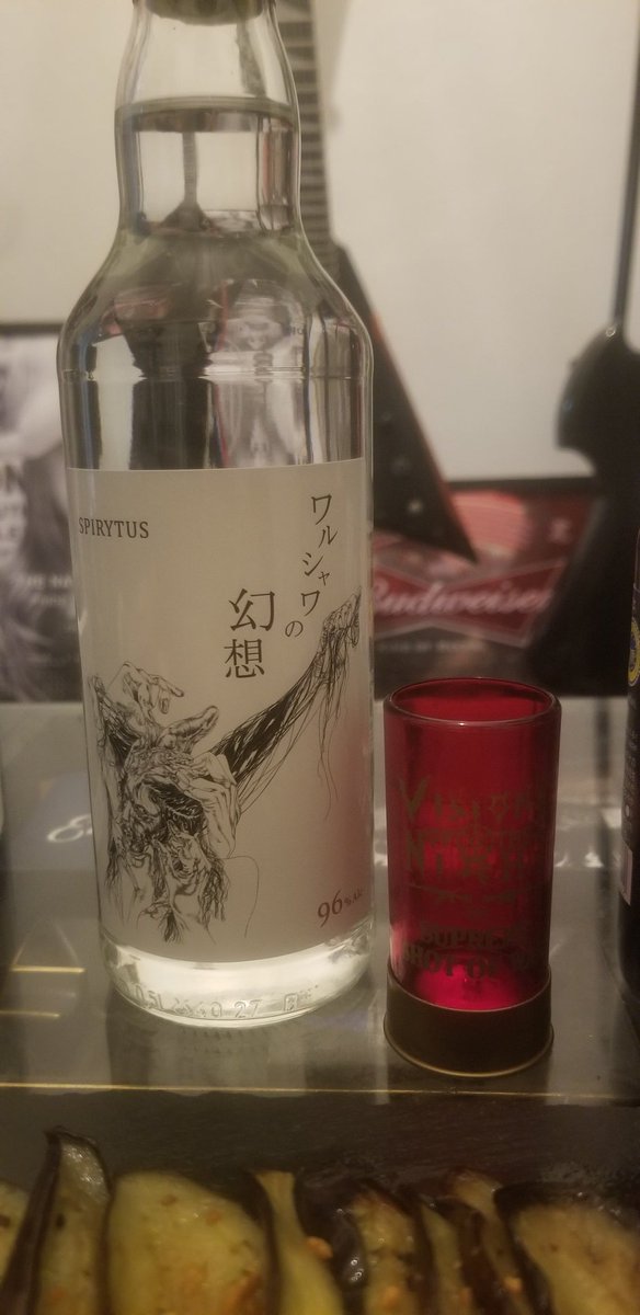 都子ちゃん、都商会さんのスターリン「ワルシャワの幻想」のスピリタスだよVisions Of The Nightのメンバーから直接頂いた赤いショットグラスで飲むぜ! 度数96なのでストロングの10倍だね! 肴は久しぶりに作った特製洋風焼きナスと生ハムpic.twitter.com/OqlMxWKtLR