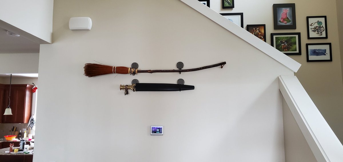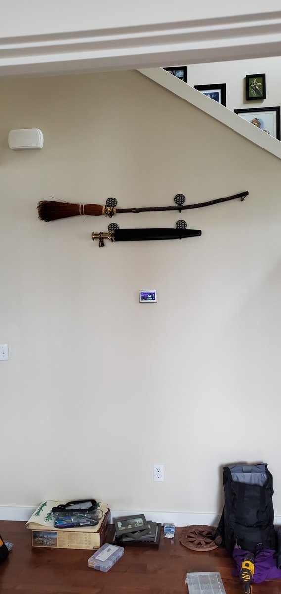Got some things up in the house. Sword and broom from our wedding, memorial for Blue, and Leah's Tribute artwork. All in all pretty pleased.pic.twitter.com/PJRcTNyUK6