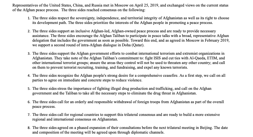 Statement released by US, Russia, and China on the occasion of the Trilateral Meeting on the Afghan Peace Process.pic.twitter.com/lit4tKCJHd