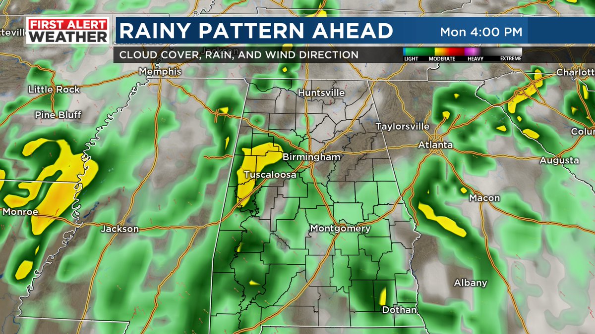 FIRST ALERT: for rain & storms to build in from MS overnight. Looking damp to start tomorrow especially I-59 & west. Storms, some strong ramp up west Wed PM & shift east during evening & weaken. Barons game could be easily impacted.