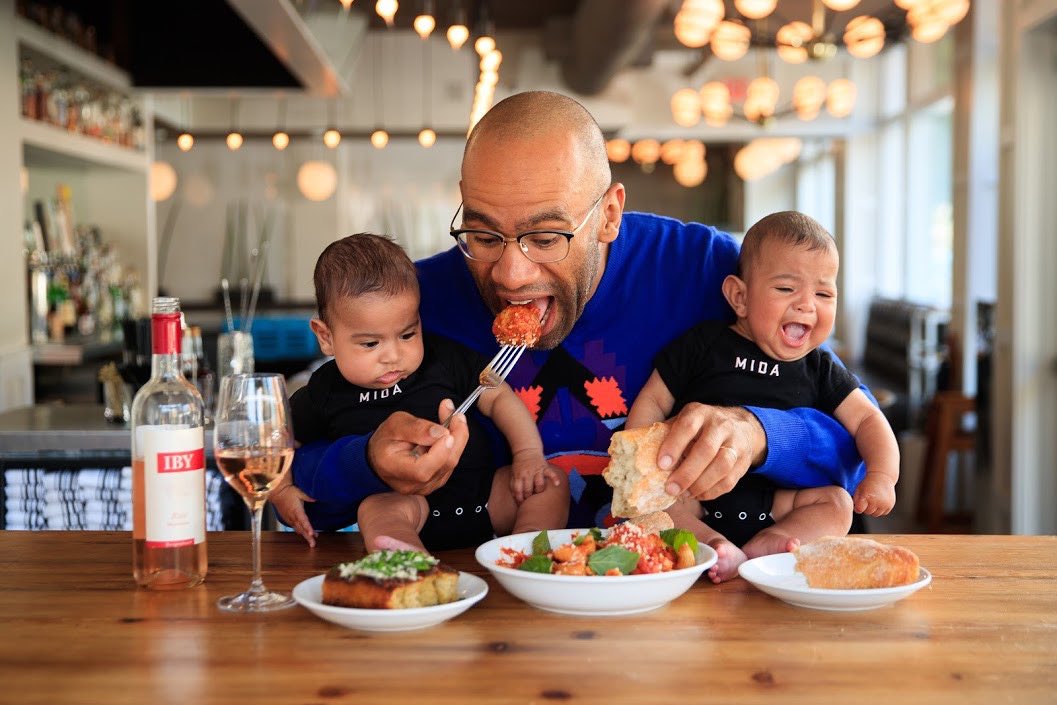 Douglass Williams of Mida restaurant has his hands full. (Great pic by Kan Photography from Eater Boston.) Pretty sure the cute twins will not be joining our conversation