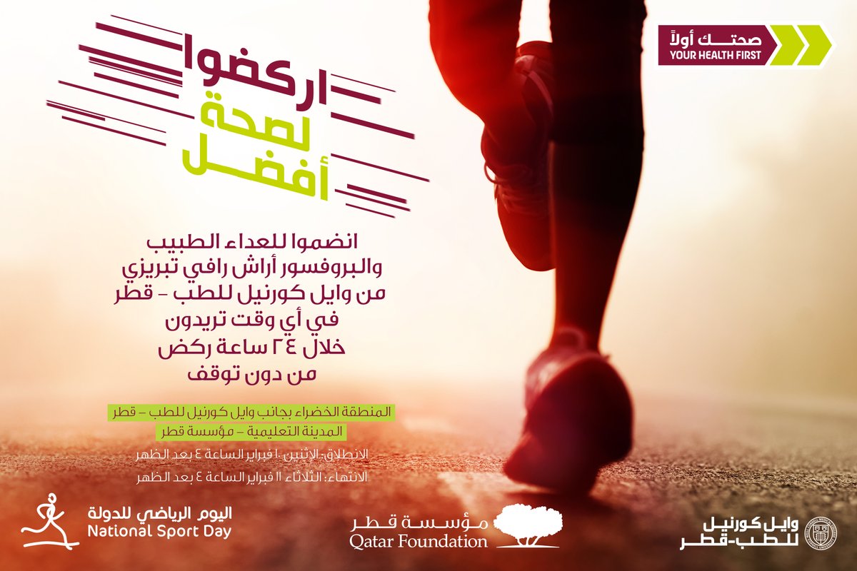 #RUN WITH ULTRA-RUNNER &@WCMQatar PROFESSOR DR. ARASH TABRIZI & ULTRA-RUNNER MOHAMAD ALLAM. WCM-Q Green Spine,#EducationCity#QatarFoundation. Join any time between Feb 10th at 4pm & Feb 11th at 4pm. See you there!@msec_q@Students_Qatar@QF@HBKU#health RTpic.twitter.com/2I0IpLwzfO