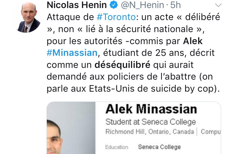 Hier, un homme a foncé sur la foule à #Toronto en tuant 10 personnes & tous les médias étaient aux aguets, puis mystérieusement : -Dépression médiatique, vocab édulcoré (fonce devient renverse) -Piste terroriste écartée -Piste déséquilibré privilégiée Devinez pk ? #AlekMinassian pic.twitter.com/LFEwC1u98i