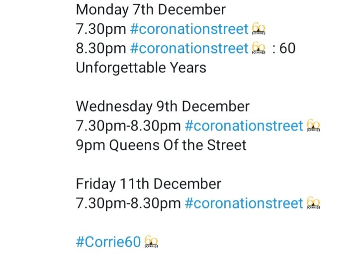 #CoronationStreet 60th Anniversary Week CONFIRMED:pic.twitter.com/MfjM9XXz7Q