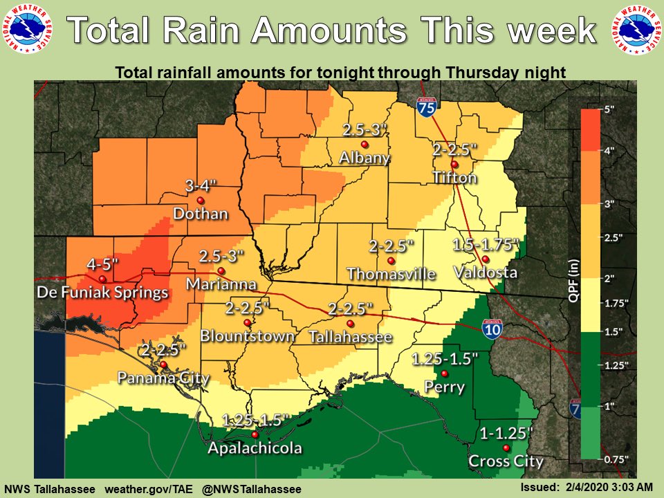 SEVERE WEATHER UPDATE (2/4/2020): Rainfall amounts continue to increase with some areas possibly seeing 4 to 5 inches. Isolated instances of flash flooding are possible and some rivers and streams may reach action or minor flooding stage.