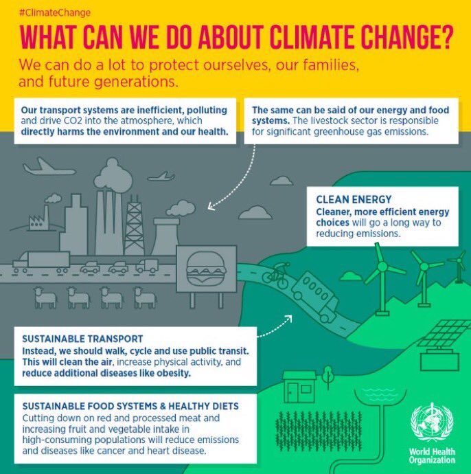 #ClimateChange & generate health benefits: - Clean energy - Sustainable transport - Sustainable food systems & healthy diets Let's take#ClimateAction for a healthier environment!pic.twitter.com/xKgSUpGRva