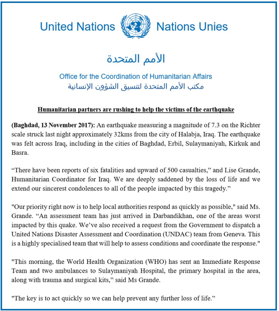 Press statement: #Humanitarian partners are rushing to help the victims of the earthquake. #Iraq Link: https://reliefweb.int/node/2322879  pic.twitter.com/znR4w58v0P
