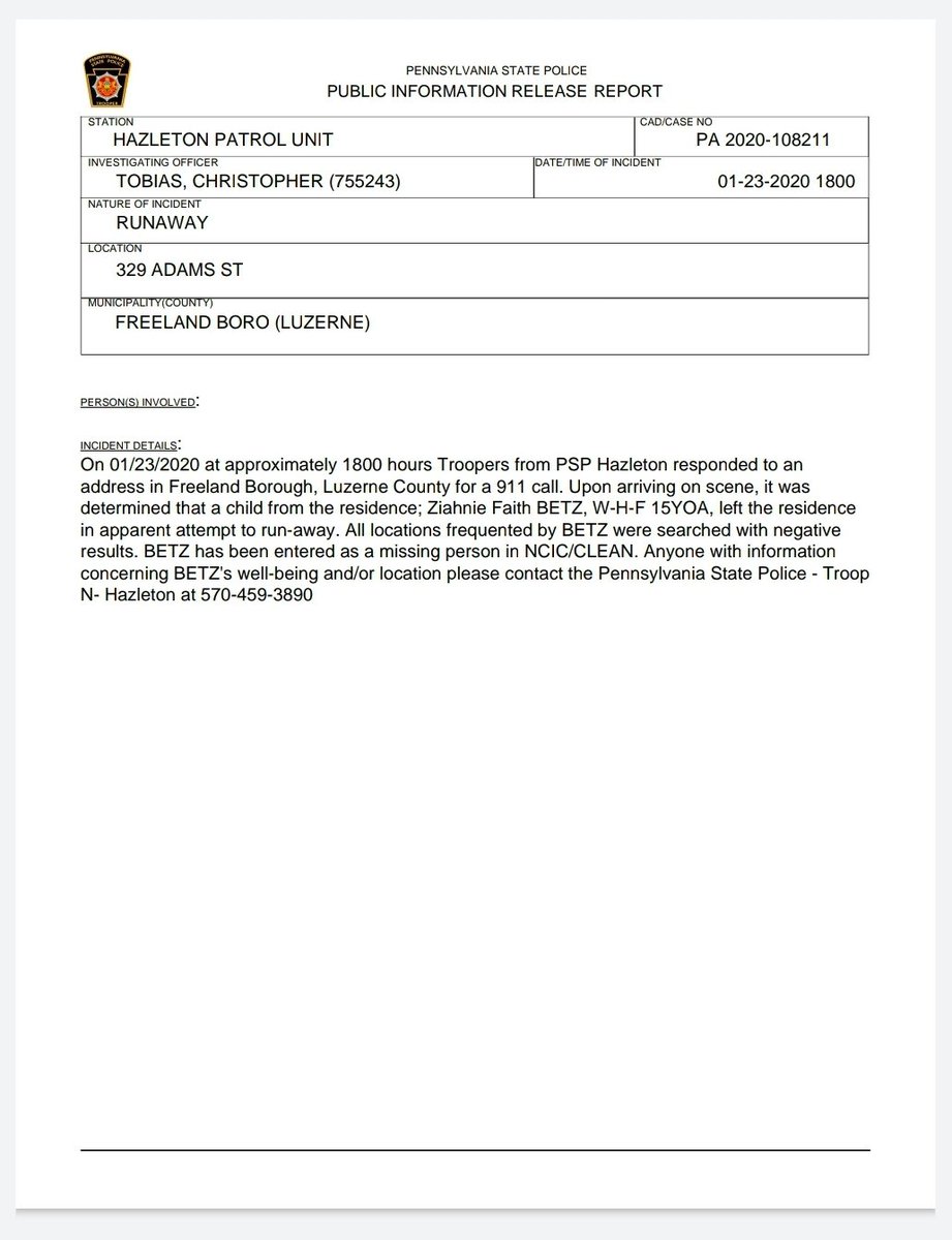 Anyone with information please contact PSP Hazleton at 570-459-3890.