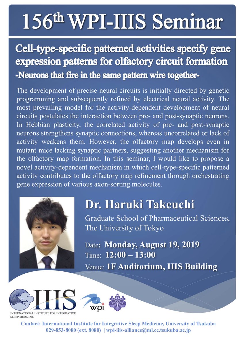 On August 19th, 12:00-, we will have the 156th WPI-IIIS seminar, "Cell-type-specific patterned activities specify gene expression patterns for olfactory circuit formation -Neurons that fire in the same pattern wire together-," by Dr. Haruki Takeuchi, The University of Tokyo.pic.twitter.com/kMJRdHWM6R