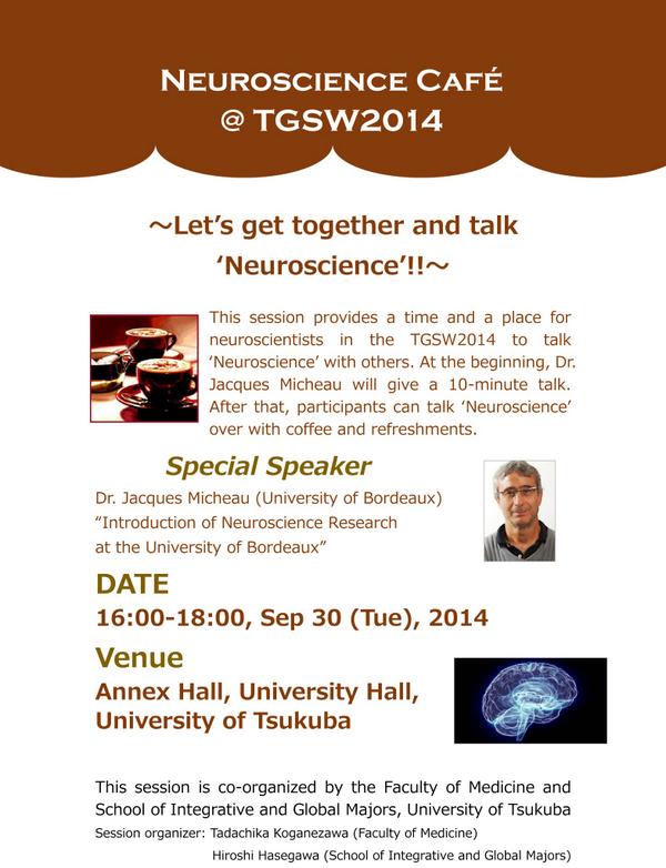 本日 #TGSW2014 内において、'Neuroscience Café'を開催します。16:00-18:00まで筑波大学大学会館別館で行う神経科学研究に興味がある方向けのイベントです。コーヒー片手に神経科学の話をしましょう。pic.twitter.com/6pUG78GVZX
