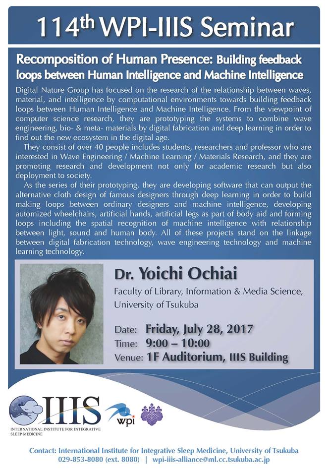 明日、7/28(金)にはカルフォルニア州立大学バークレー校の神垣司さんによる第115回IIISセミナーも開催します!IIISセミナーのスケジュール①9:00~10:00 Dr.Yoichi Ochiai ②15:00~16:00 Dr.Tsukasa Kamigakipic.twitter.com/jh4O1U4cPb