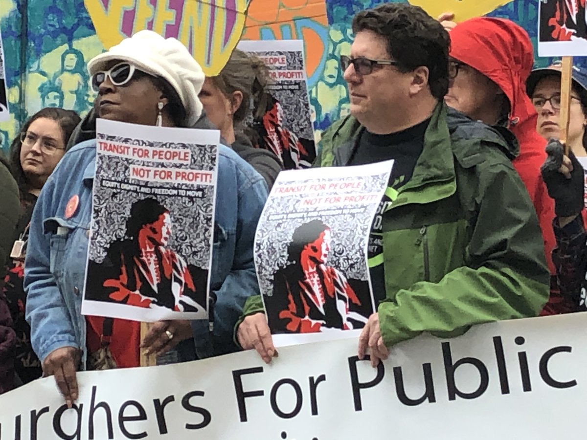 Demonstrators are holding TRANSIT FOR PEOPLE NOT FOR PROFIT! signs