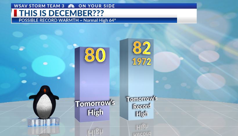 #Savannah has tied the record high today. 82 set in 1972 If we get up to 83, not only will we break the daily record but we will tie the monthly record of 83 degrees.#Lowcountry#HiltonHeadIsland@WSAV@KyleDennisWx@WSAVScottR@WSAVAlysaCpic.twitter.com/V5QC7k6R71