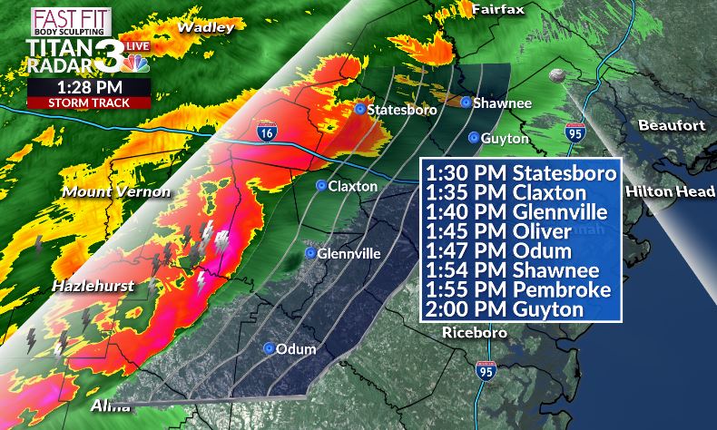 Storm Update ~ 1:30pm Severe Thunderstorm Warning: Tattnall County Line of storms is moving to the east at around 30mph. Estimate on storm arrival.