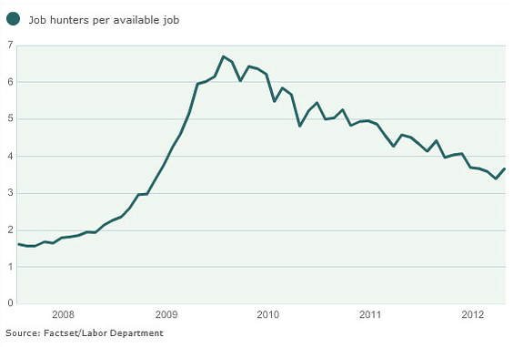 Ratio of unemployed to available jobs: 3.65 in April. Still above prerecession levels of around 2. http://on.wsj.com/O6L0gs pic.twitter.com/a1S50YOE