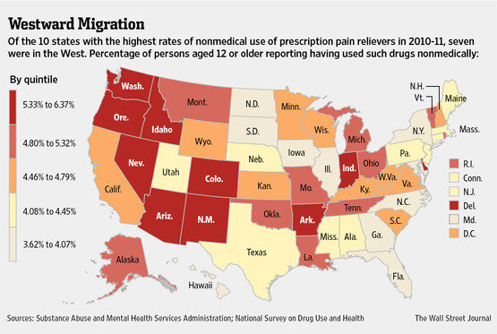 @WSJ: Epidemic in painkiller-abuse from Southern and Eastern U.S. is now hitting West. http://on.wsj.com/YVGTTz pic.twitter.com/V7AWYDOn6Z”