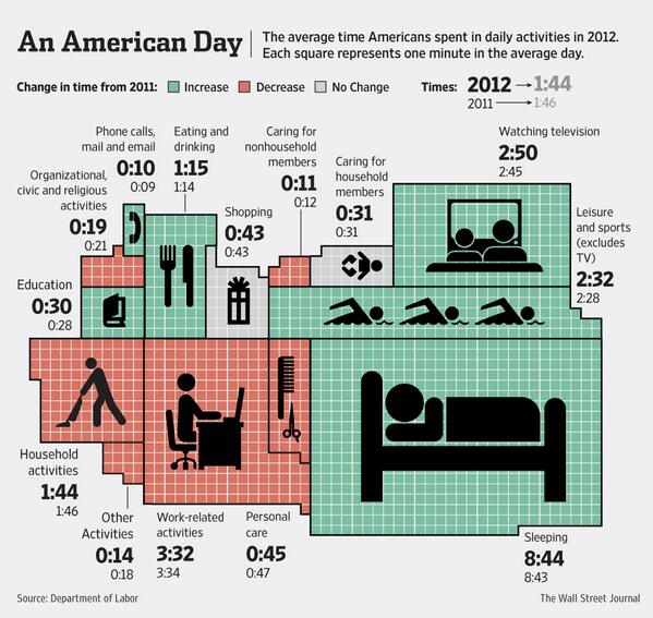 Who's sleeping so much the average is 8.75 hours a night?? MT @WSJ: Americans worked less, watched more TV in 2012:http://on.wsj.com/11RATh6