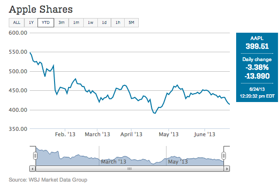 @WSJ: Apple shares fell below $400 today for the first time since April: http://on.wsj.com/19l8fOa$AAPL pic.twitter.com/KxcvrfrBpN”