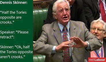 Dennis Skinner, of UK Labour Party, delivers a punchline worthy of any Comedy Sitcom "half the tories r crooks"