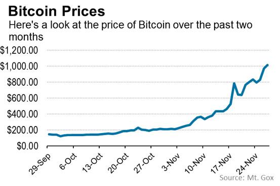 #Bitcoin topped $1K for the 1st time on Wed;@WSJ plots its rise over past 2 mos: http://on.wsj.com/1bW74QW pic.twitter.com/CSMEZXJnCz