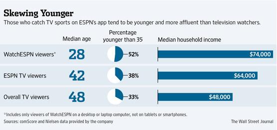 Mmhmm! “@WSJ: Users of ESPN's app tend to be younger, more affluent than overall TV viewers. http://on.wsj.com/1et4raI pic.twitter.com/tlaC82WCrt”