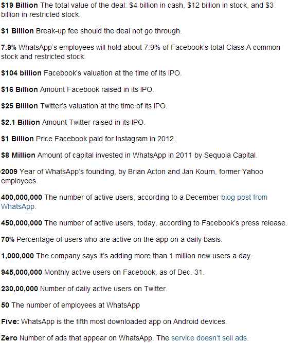 That last one is important. RT @WSJ The $19 billion Facebook-WhatsApp deal, by the numbers: http://on.wsj.com/1bmSDvr pic.twitter.com/yH532vhbNY