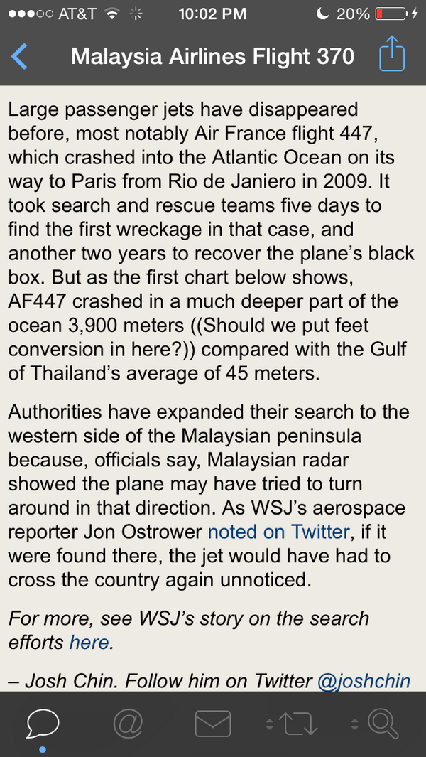ホンマでっか。QT“@WSJ: Breaking: Search for missing #MH370 jet now focused on west Peninsular Malaysia. Updates here: http://on.wsj.com/1kd6eGf ”