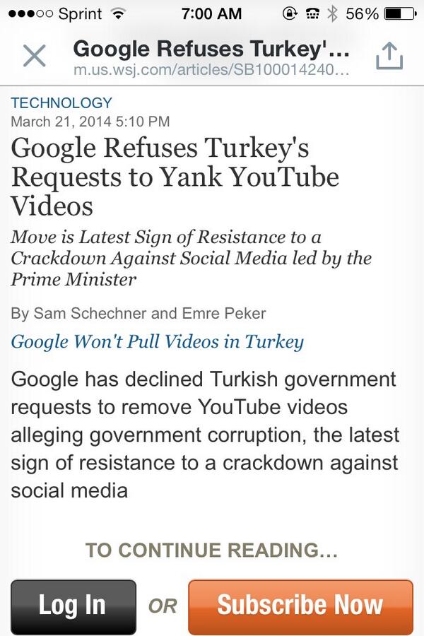 Big deal. RT @WSJ Google declined Turkish government requests to remove @YouTube videos alleging govt corruption http://on.wsj.com/1nLf96N