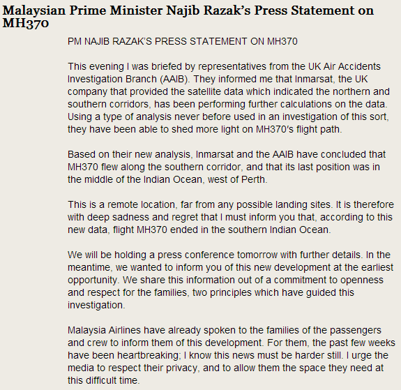 “@WSJ: Full text of Malaysian prime minister's statement on flight #MH370: http://on.wsj.com/1jmOLy7 pic.twitter.com/MBMFm9nSA3”