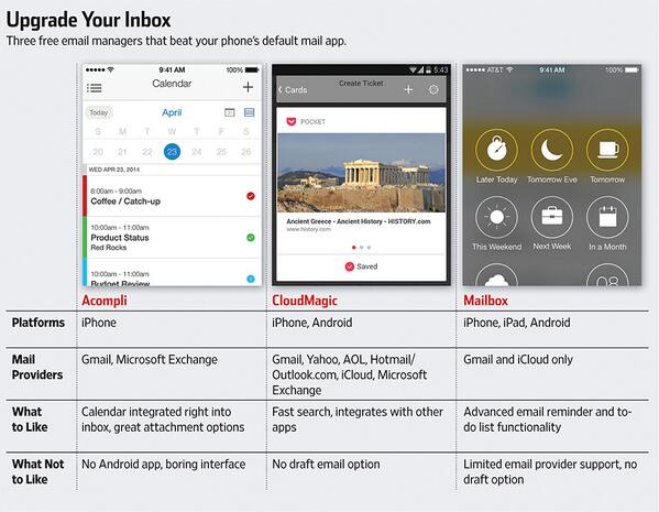 “@WSJ: Frustrated by email on your phone? These apps can help: http://on.wsj.com/1mmiyIA pic.twitter.com/ZNqDkVI1Z7” --> nice article