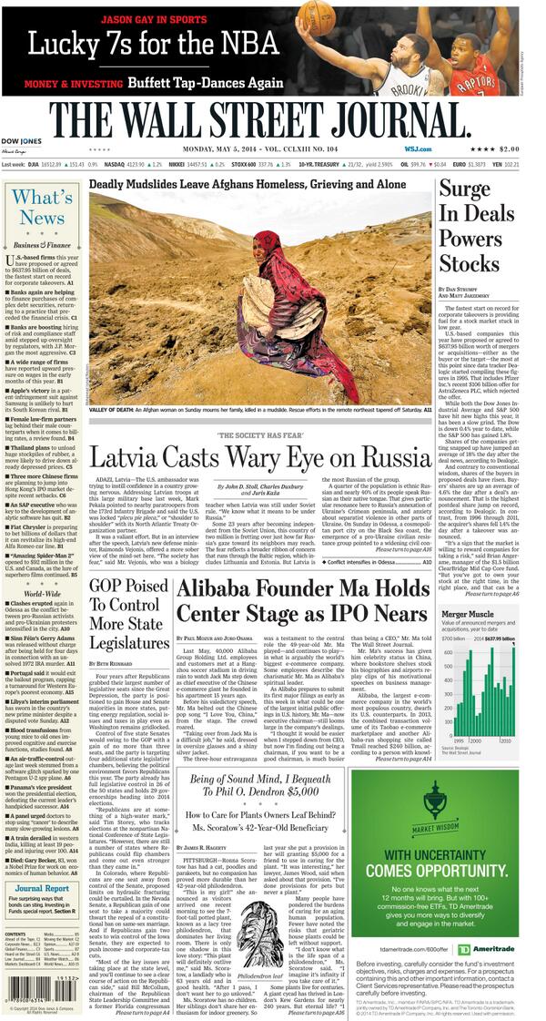 “@WSJ: GOP gains, Latvia concerns and corporate deals, all on today's front page. pic.twitter.com/S2e0R0g4dN”