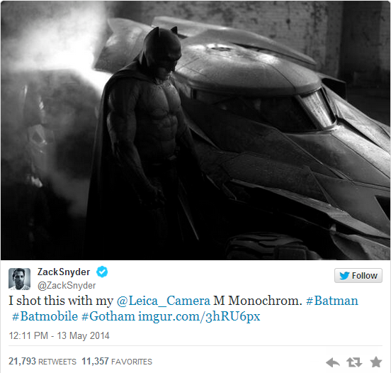 @WSJ: Director of new Batman vs. Superman movie tweets a peek at new Batsuit and Batmobile: http://on.wsj.com/1litIYt pic.twitter.com/rsD3eg6y7w”