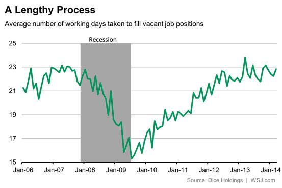 @WSJ:US businesses now take 22.5 days to fill job, up from 16.7 days in 2009. http://on.wsj.com/1k1qiMO pic.twitter.com/GzLPPqbxxD”@DestinDexter