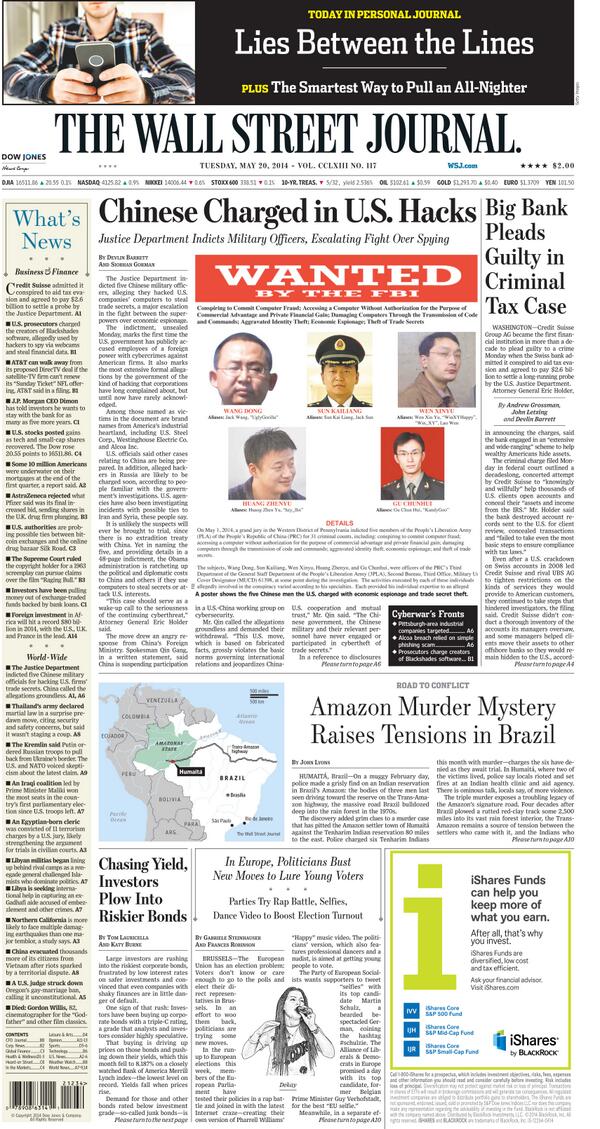 “@WSJ: US charged 5 Chinese military officers with hacking companies' computers. http://on.wsj.com/1kjRmY2 pic.twitter.com/z83QaO3QXB” what a pg 1