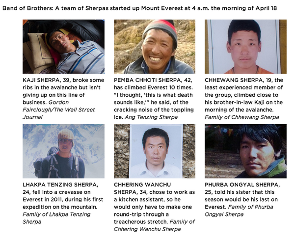 “@WSJ: Death at 19,000 Feet: The inside story of the deadliest day on Mount Everest. http://on.wsj.com/1n5NRW2 pic.twitter.com/MsLKBMxH93”