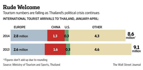 “@WSJ: #Thailand has seen a sharp drop-off in tourists as instability continues: http://on.wsj.com/1n7DwsF pic.twitter.com/igWBemNOU6” @Hepburn52