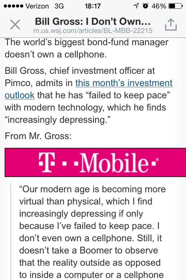 @WSJ: One thing@PIMCO's Bill Gross doesn't own: a cellphone. http://on.wsj.com/1kEBGPR pic.twitter.com/SQ01eRozVC