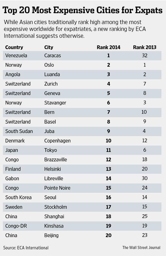 “@WSJ: A look at the most expensive cities for expats: http://on.wsj.com/1xHvbkp pic.twitter.com/kblI4HFdcr”. / #venezuala not looking great