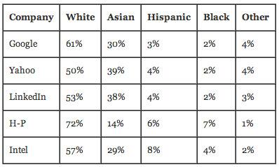 #diversity stats “@WSJ: 91% of Google and LinkedIn employees are white or Asian. http://on.wsj.com/UhLfu0 pic.twitter.com/6C34Oy03Di”