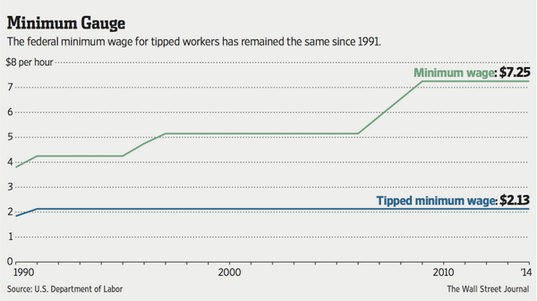 @WSJ: The U.S. tipped minimum wage of $2.13 per hour hasn't risen in over 20 years. http://on.wsj.com/1rBsnUP pic.twitter.com/kfvy5czr9y