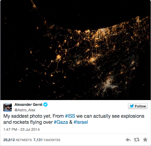 @WSJ: German astronaut tweeted his "saddest photo yet," claiming to show Gaza from space: http://on.wsj.com/Uvuxql pic.twitter.com/86vjFpKX83”wow