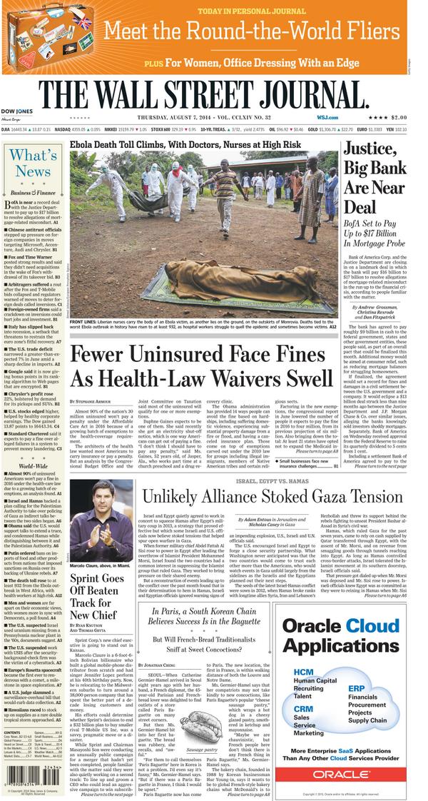 “@WSJ: Stories made front page pic.twitter.com/GAkA3B8lVC” Love getting the newspaper without the ink stained hands. #oldmediadigitalmediafusion