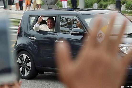 “@WSJ: Pope Francis rides around Seoul in a Kia, giving the car marker much needed publicity http://on.wsj.com/1peiUAy pic.twitter.com/l2lyLq6EKi”