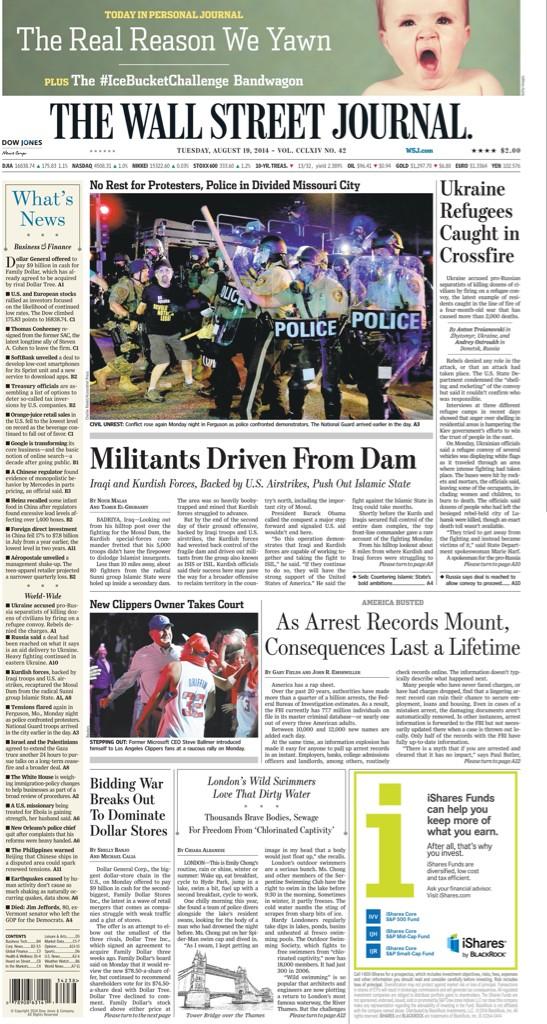 @WSJ: "Militants Driven from Dam in#Iraq" OR "Millennials Driven from Strrets of#Ferguson"?You pick the headline. pic.twitter.com/NNActm2XxO”