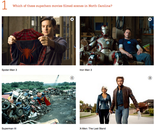 RT @WSJ: Test your movie knowledge w/ our quiz on which movies were filmed in North Carolina: http://on.wsj.com/XAntv2 pic.twitter.com/MUFYTmm9gT