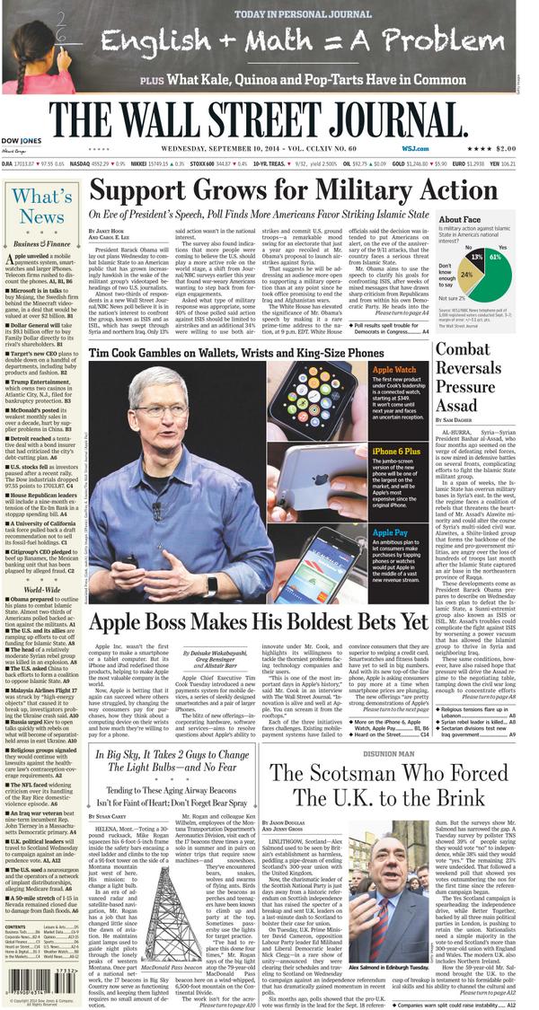 “@WSJ: Apple boss's bold bets, military action, a lively Scotsman and light bulbs in the sky. Today's front page: pic.twitter.com/b8WazIs8Un”