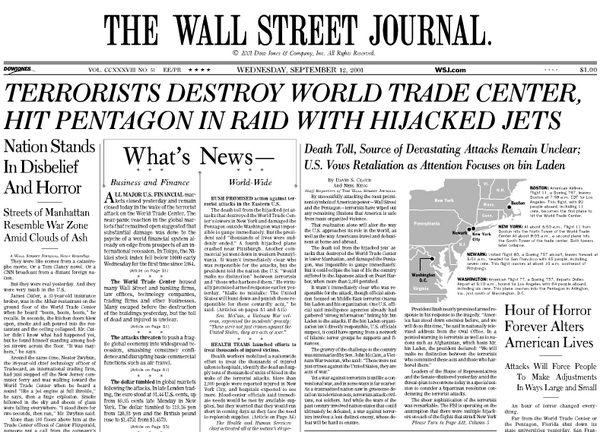 “@WSJ: A look at the Journal's original #September11 coverage from the Sept. 12, 2001 edition: http://on.wsj.com/YzSZK8 " #NeverForget