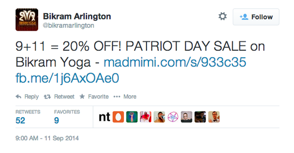 Another business goofs up social media again on 9/11. This time it is Bikram Yoga Arlington(VA) pic.twitter.com/R52AWkl3H1 (via @gobospring)